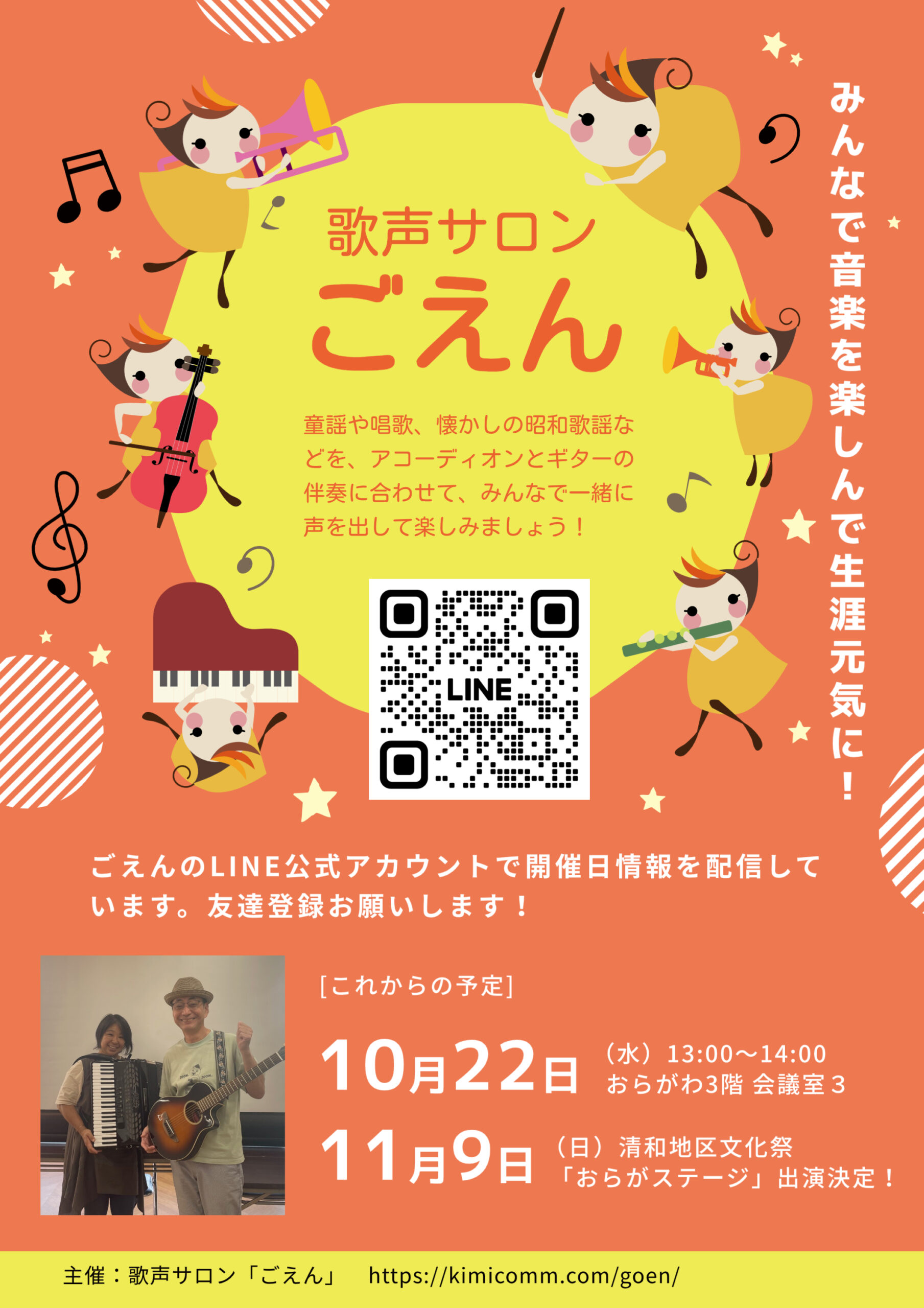10月22日(水)はいつもの歌声サロンの日です。場所はおらがわ3階の第3会議室、事前の申し込みは不要です。ぶらっと遊びに来てください!