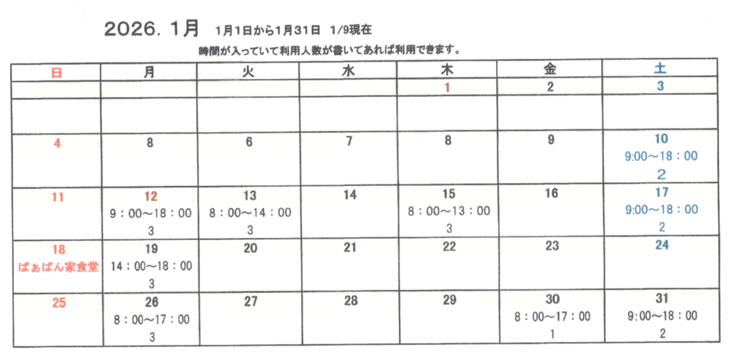 *訪問が入る場合、または都合により「ばぁばん家ぱーと2預かり」は休みになります。