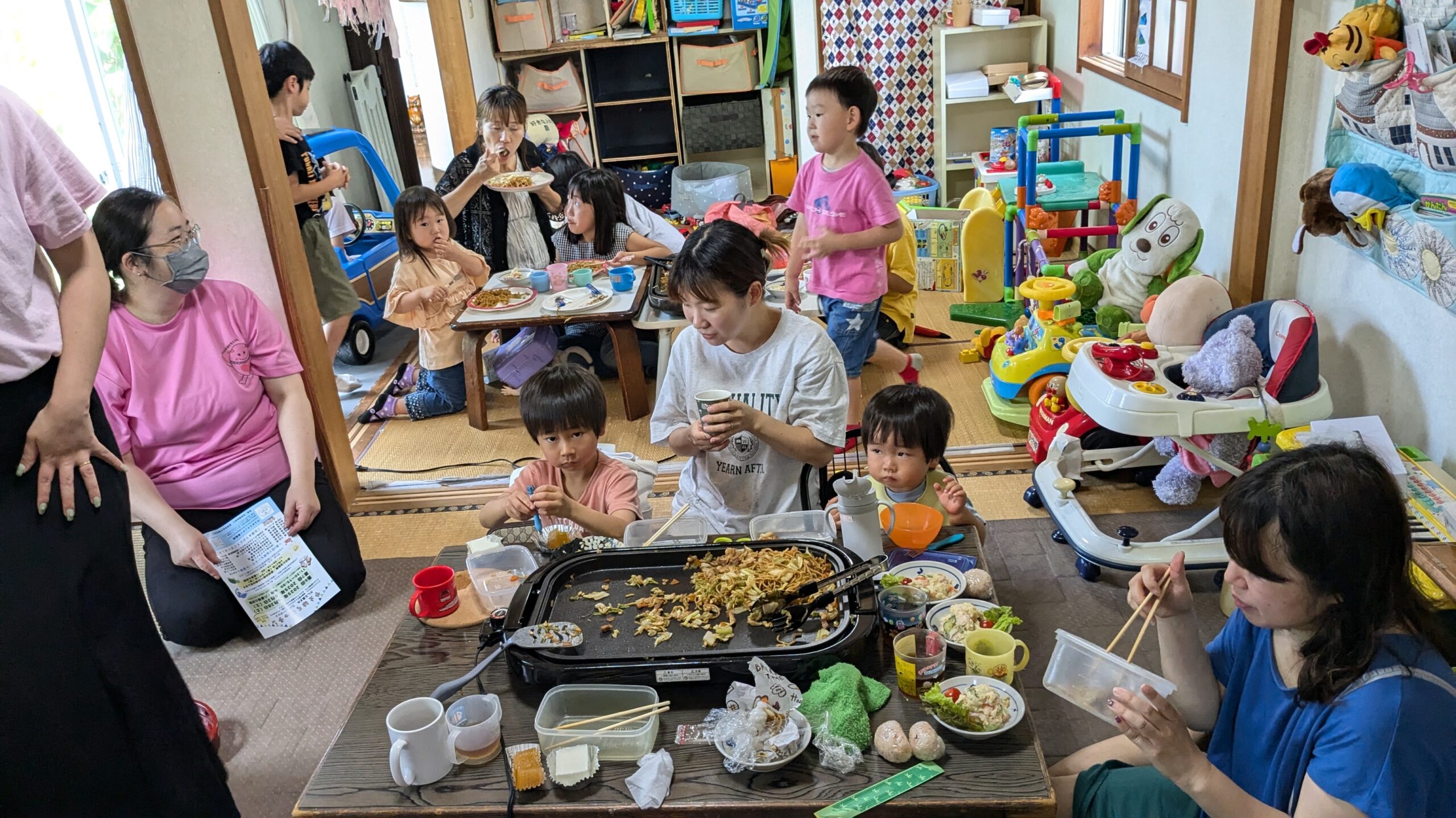 2025年6月15日、第1回「ばぁばん家(ち)食堂」を実施しました。6組の親子が来てくれました。遊び場と食堂とややごちゃりな感じでしたが、食べ終わってからのゆったりタイムでおしゃべりしたり、ボードゲームをしたり、14時解散になりました。また来月のお好み焼きで会いましょう。具材は何がいいかな?
