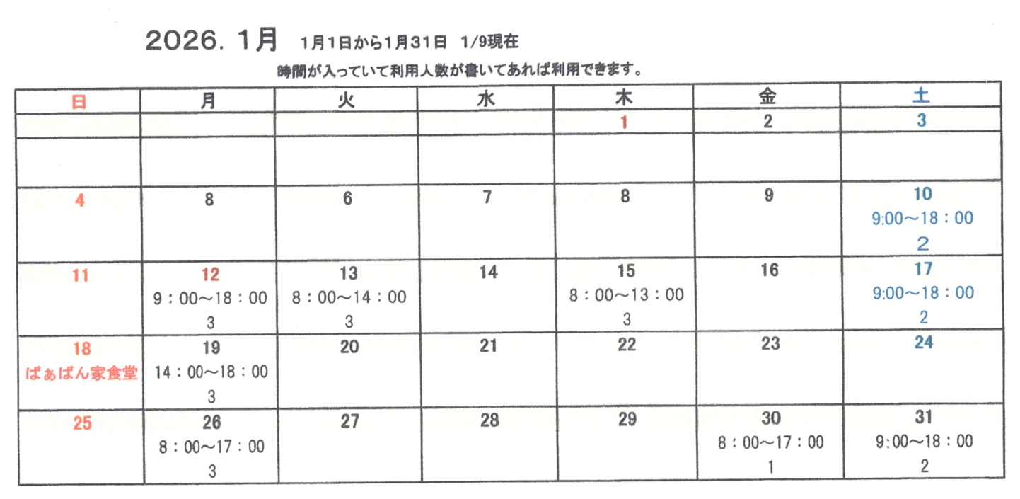 ばぁばん家(ち) ばぁばん家ぱーと2 空き状況表 2025.12.17 2026.01.10 ばぁばん家(ち) 利用できる日時は時間が入っている日で、その時間内は利用できます。0歳は2人カウントで3人まで。残り空き人数を記入しています。利用希望の方は mamasuma@jcom.home.ne.jp へ、または佐藤携帯に連絡ください。 Post Share キッズファッションショー盛会裏に終わる、来場者900名‼ 前の記事 ばぁばん家(ち) ママの笑顔を考える会の「ばぁばん家」と君津市認定の家庭的保育者による「ばぁばん家ぱーと2」があります。どちらも 佐藤家の自宅での子ども一時預かりです。利用の時は連絡ください。 関連記事 周西公民館文化祭で「ばぁばん家(ち)食堂」を開催(小麦粉粘土親子遊びもしました) 2025.11.22 ばぁばん家(ち)ぱーと2 2025.06.18 「にこにこママ笑顔」2ヶ月から就園までのお子さんがいるママの居場所。おしゃべりしてリフレッシュしましょう。 2025.04.14 2025年6月15日 第1回「ばぁばん家(ち)食堂」を実施しました。 2025.06.15 要望により「ばぁばん家(ち)食堂」が毎月1回の日曜食堂としてスタートします。 2025.06.16