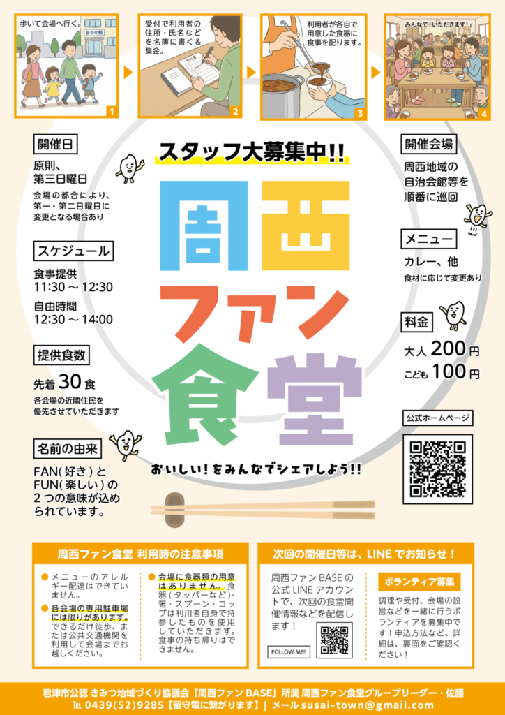 周西で初となる、地域の方であれば、こどもから大人まで誰でも利用できる地域食堂です。ひと月ごとに、周西地域の自治会館などを順番に巡って開催します。「FAN(好き)」と「FUN(楽しい)」、2つの意味が込められたこの食堂で、みんなでおいしく、楽しく、温かい時間を過ごしませんか?